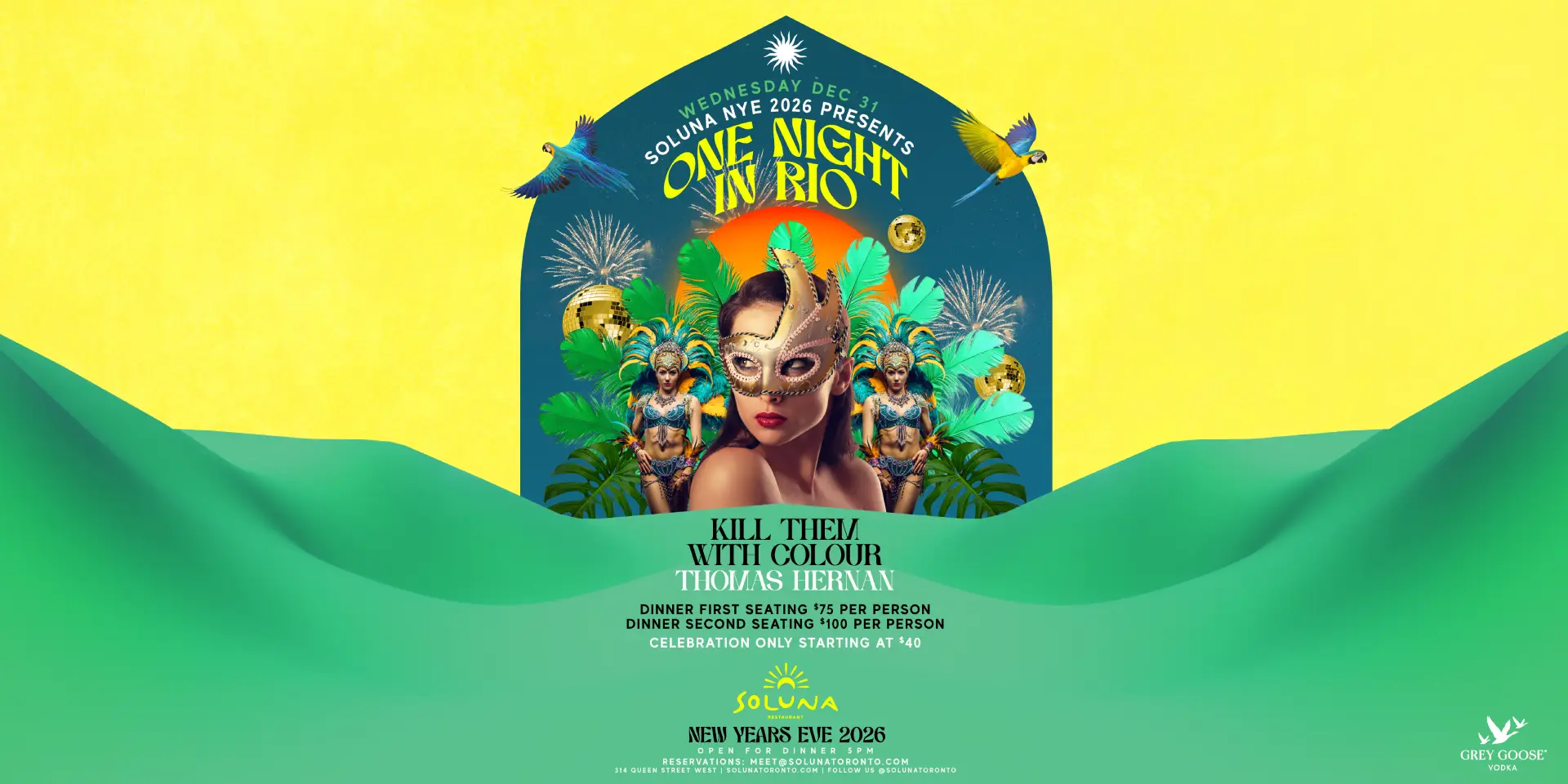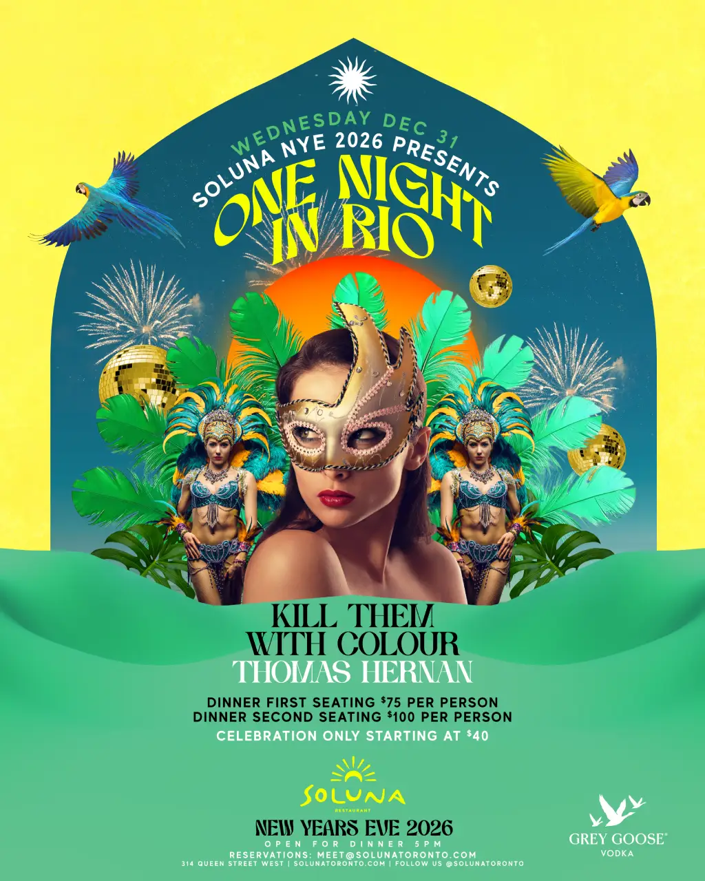 Step into a world inspired by Rio’s iconic nightlife. This New Year’s Eve, Soluna transforms into a high-energy fusion of music, dance, and immersive entertainment. Expect tropical cocktails, live performers, dazzling visuals, and a countdown unlike any other in Toronto.