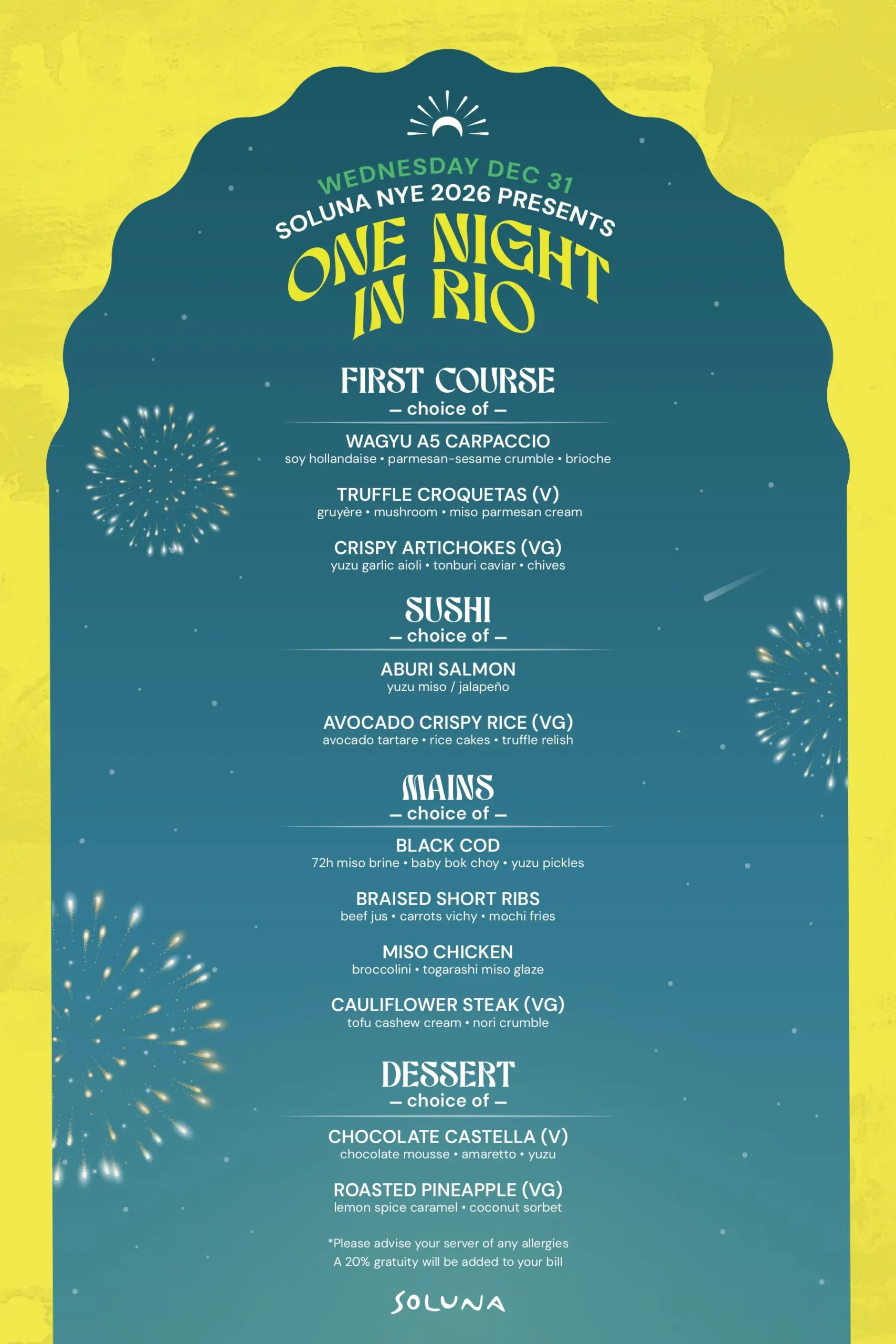 Enjoy an elevated NYE dinner with a curated menu inspired by flavours of Rio and Soluna’s coastal Latin cuisine. Our dinner experience includes specialty cocktails, entertainment, and VIP treatment throughout the night.